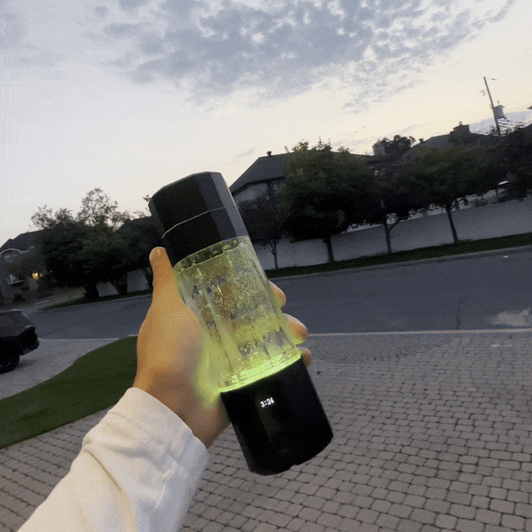 Turn on your HydroPro Bottle™ and watch hydrogen bubbles rise in the blue light!